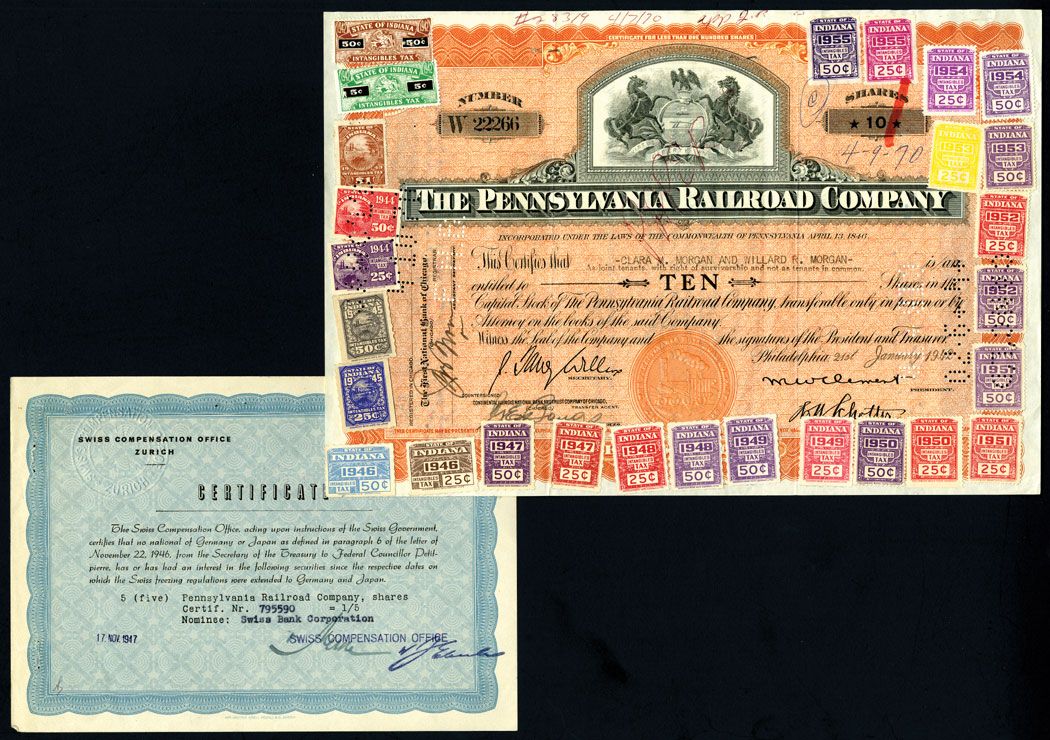 Philadelphia, PA., 10 Shares I/C Stock, S/N 22266, with Tax stamps as well as Swiss Compensation Certificate. VF.
