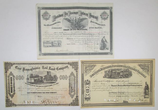 Pennsylvania, 1872-1923. Lot of 3 Railroad I/C Stock Certificates, Includes: 1872, Dunkirk, Warren & Pittsburgh Railway Co., 1 Share Capital Stock; 1872, East Pennsylvania Rail Road Co., 2 Shares Capital Stock; and, 19923, Harrisburg City Passenger Railway Co., 6 Shares Capital Stock. Fine to VF condition. (3). Sold "AS IS" no returns accepted.