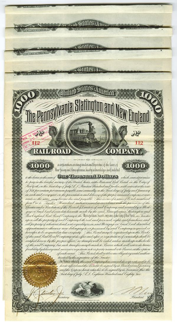New Jersey & Pennsylvania. 4 Pieces. Group of Bonds all $1000 Issued 6% Coupon Bond, Black print on black border and under tint, Allegorical winged figures flanking oncoming locomotive, Fine-VF condition with minor splitting along fold lines condition, ABNC.