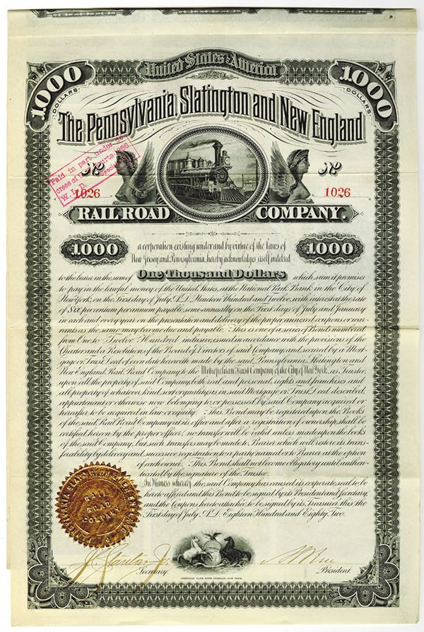 NJ & PA, 1882. $1000 I/U 6% First Mortgage Coupon Bond, Black text with black border, Train passing on tracks flanked by allegorical female statues at top center. Paid stamp at top left corner, Fine-VF condition. ABNC.