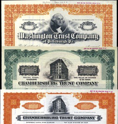 ca.1900-1950's. <100; Odd Shs. 7 different specimens. Banks include: Washington Trust Company of Pittsburgh Pennsylvania; Chambersburg Trust Company; Commonwealth Trust Company; Continental-Equitable Title and Trust Co.; Beaver Trust Co. and Bank of Old York Road. All are different colors and are vignetted. Scarce and attractive bank group. SBNC, SCBNC.