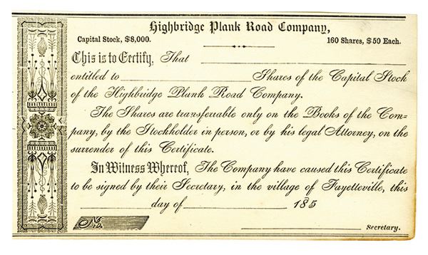 Pennsylvania, Lot of 4 Stock certificates, Includes 185x Highbridge Plank Road Co., Unissued; Allentown & Bethlehem Turnpike Co., 1878, I/C; 1882, Sherrystown and Hanover Turnpike Co., I/U; 1899, Providence and Abington turnpike and Plank Road Co., I/C, Fine to VF condition.