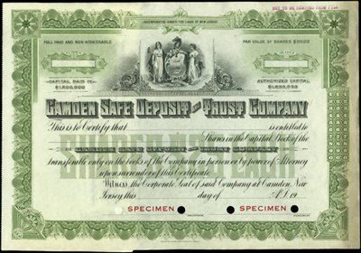 PA, NJ. 1910-1954. Specimen. 4 different certificates. All Odd shares. 1) Camden Safe Deposit and Trust Co., Camden, New Jersey. NJ State Seal. Toning on right. 2) Camden Trust Co., Camden, New Jersey. Allegorical women flank "CTC" initials. Small tear in right hand margin just touching design. 3) Commonwealth Trust Co., Harrisburg, PA. Pennsylvania State coat of arms. 4) Beaver Trust Co., Pennsylvania. Eagle vignette. SBNC, SCBNC. VF-XF.