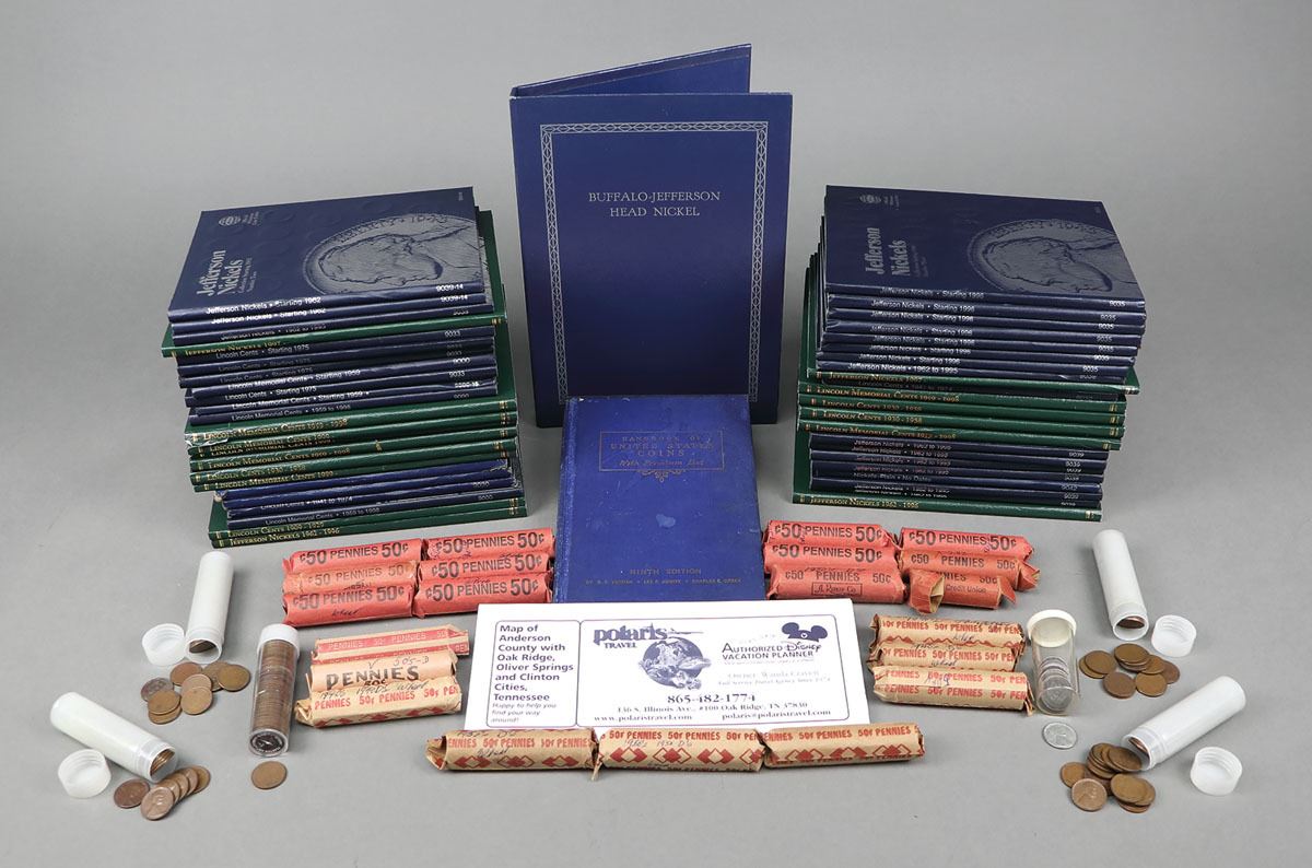 lot of hundreds of pennies and nickels in 40+ partially and fully filled books and 24 penny rolls that are unsearched; highlights include a 1930-58 penny book with Choice Red Uncirculated 1934, 1936-D, 1937-S, 1938-D, 1939 with the rest of the book filled with VG to AU condition coins; there are a few penny books dating from 1960 on in AU to Uncirculated condition and a few nickel books dating 1990s on in uncirculated condition; balance of the books partially complete, missing key issues and in Good to Fine condition; inspection recommened. Shipping charges apply - weight 44 lbs. (photo on web site)