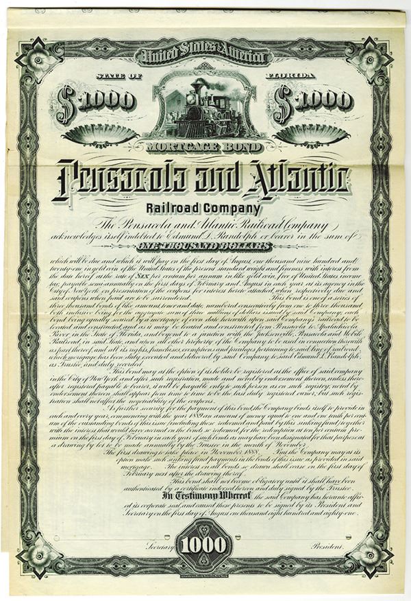 Florida, 1881. $1000 Specimen vertical format, mortgage, bearer gold coupon, 6%, 40-yr, 1881, due 1921, Black text with black border, Train approaching busy station at top center. POCs, Fine condition, ABNC. Only known as a specimen in Cox with only 2 examples found, Very Rare.