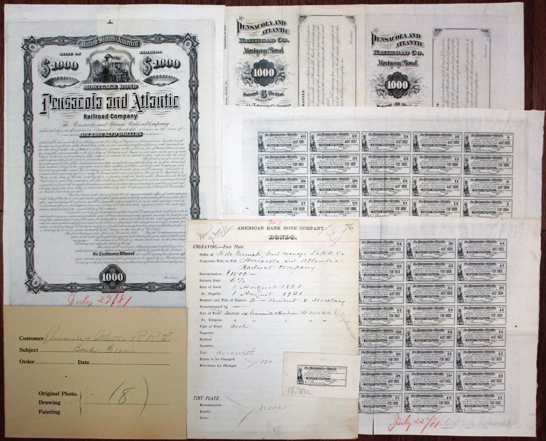 Florida, 1881. Lot of 7 pieces, all related to the production of bonds from ABNC and are with black text on white india paper, includes: $1000 Progress Proof 6% Mortgage Bond, intaglio printed with notes at bottom; Pair of intaglio printed Progress Proof coupon sheets; Progress Proof bond back with notes on bottom, including approval initials; Also included is a small intaglio Coupon proof with approval initials in pencil at bottom; American Bank Note Co. bond printing form with relevant design and detailed information; and an envelope for relevant materials. Previously only known as a specimen, no issued examples seen. VF to XF condition. Unlisted and unique proof bond production file. (7)
