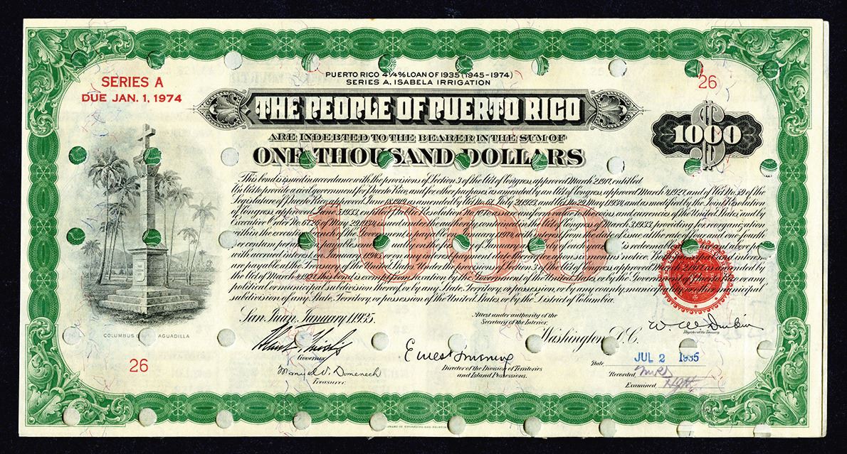 Puerto Rico, 1935. $1000 I/C, 4 1/4% Coupon Bond, Black print on green border and red underprint, Title at top with statue dedicated to Christopher Columbus at left, S/N 26, Fine-VF condition. BEP.