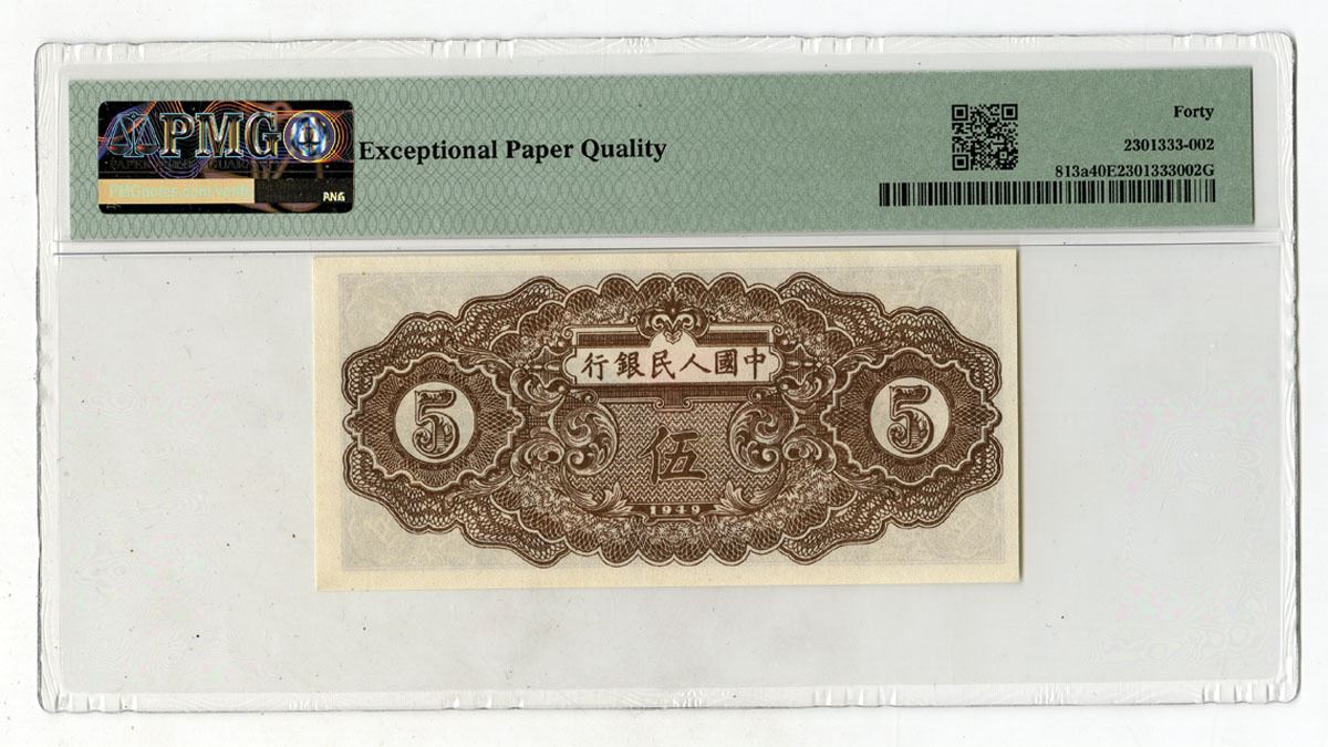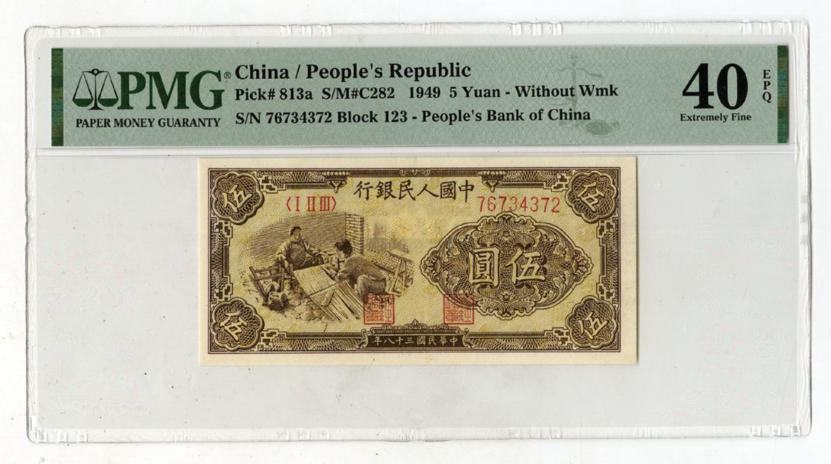 China. 1949. 5 Yuan, P-813a, S/M#C282, issued banknote, Brown on light gold underprint with weavers at left, Back is dark brown, S/N 76734372 Block 123, PMG Graded Extremely Fine 40 EPQ.