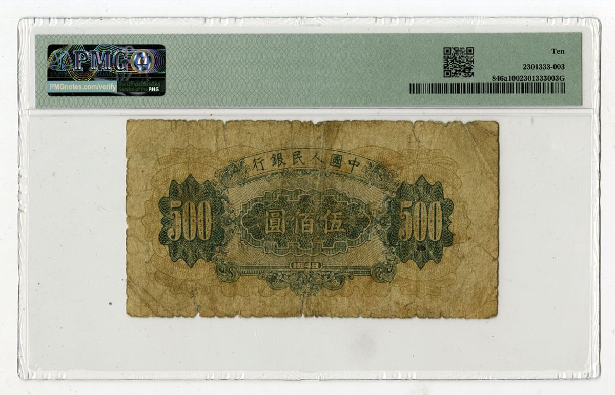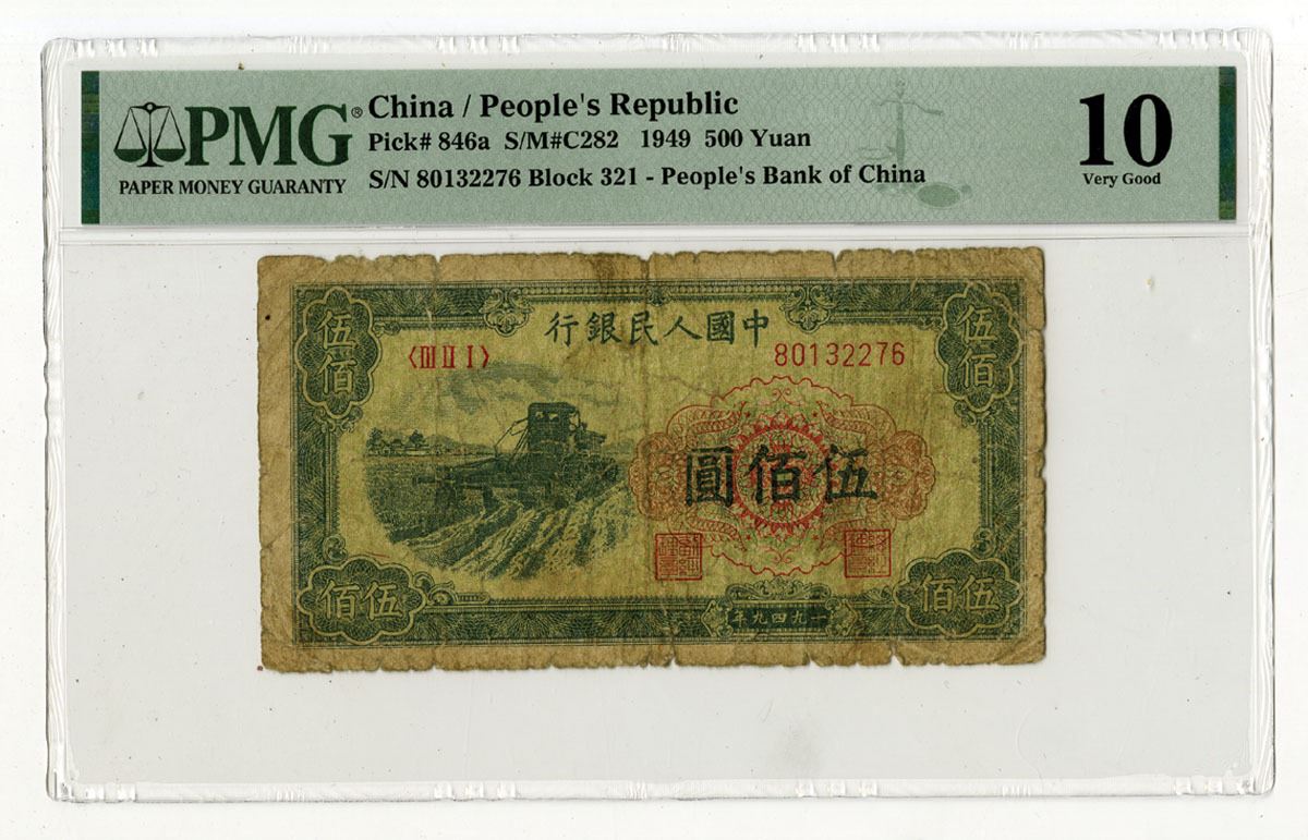 China, 1949. 500 Yuan, P-846a, S/M#C282, Issued banknote, Black with m/c guilloche at right with tractor plowing fields at left, Back is brown and blue, S/N 80132276 Block 321, PMG graded Very Good 10.