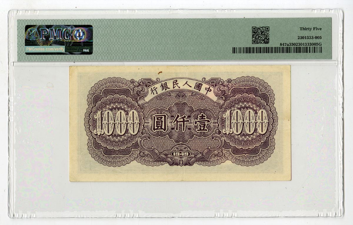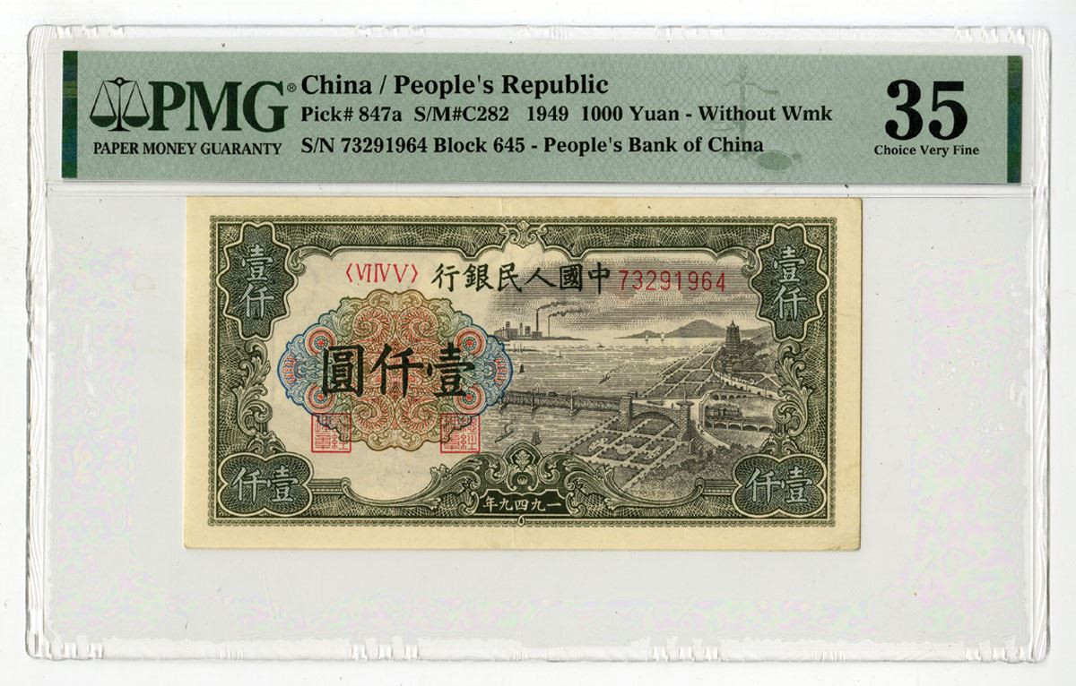 China, 1949. 1000 Yuan, P-847a, S/M#C282-61, Issued banknote, Black with m/c guilloche and left and town view with bridge at right, Back is purple, S/N 73291964 Block 645, PMG graded Choice Very Fine 35.