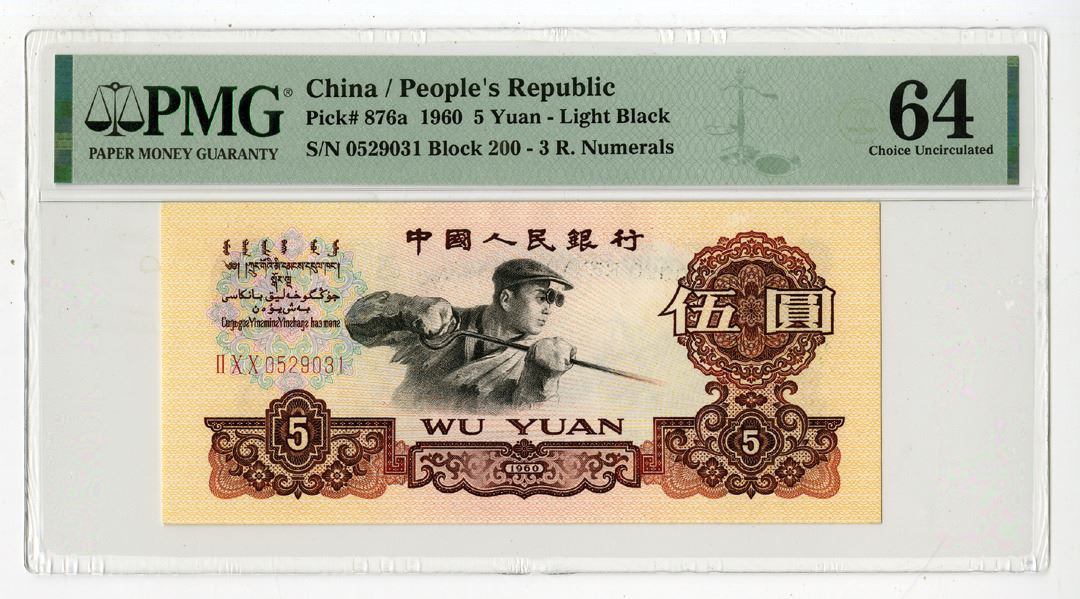 China, 1960. 5 Yuan, P-876a, Issued Banknote, Brown and pale pink on m/c underprint with worker at center; Back is m/c with construction and railroad at center, S/N 0529031 Block 200, PMG graded Choice Uncirculated 64