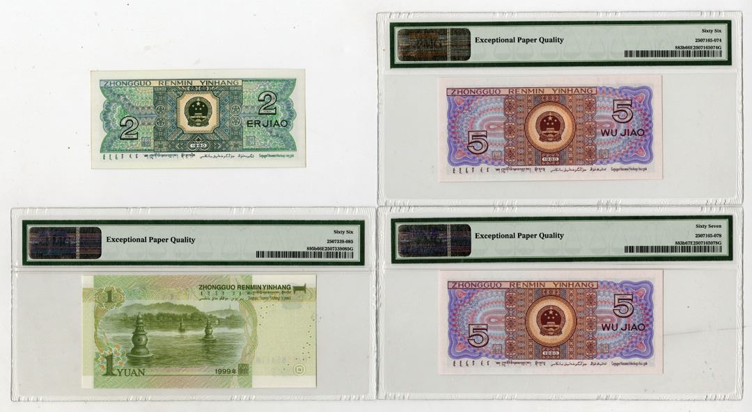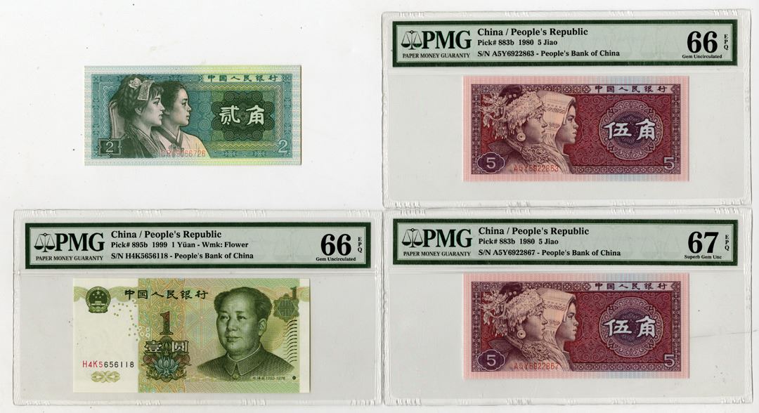 China, 1980-1999. Lot of 4 Issued Banknotes, Includes: 2 Jiao, P-882a, Grayish olive-green on m/c underprint, Native youth at left, Back Is green on m/c with arms at center, S/N CR09066726, XF-AU condition; 5 Jiao, P-883b (2), Violet and purple on m/c underprint, Miao and Zhuang children at left, Back is brown-violet on m/c underprint with arms at center, S/Ns A5Y6922863 & A5Y6922867, Notes are PMG graded Gem Unc 66 EPQ and Sup Gem Unc 67 EPQ; 1 Yuan, P-895b, Pale green on m/c underprint with Mao Zedong at right, Back is green on m/c with river valley at center, S/N H4K5656118, PMG graded Gem Uncirculated 66 EPQ. (4). Sold "AS IS" no returns accepted.