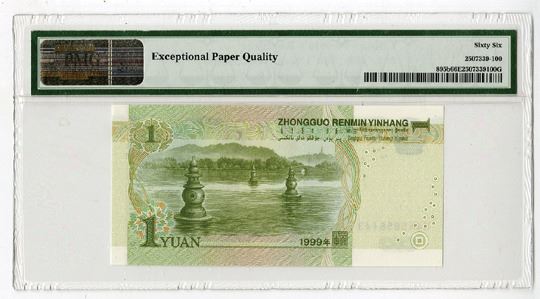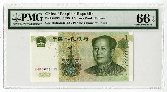 China, 1999. 1 Yuan, P-895b, Issued Banknote, Pale green on m/c with Mao Zedong at right, Back is pale green on m/c with river scene, S/N H4K5656143, PMG graded Gem Uncirculated 66 EPQ
