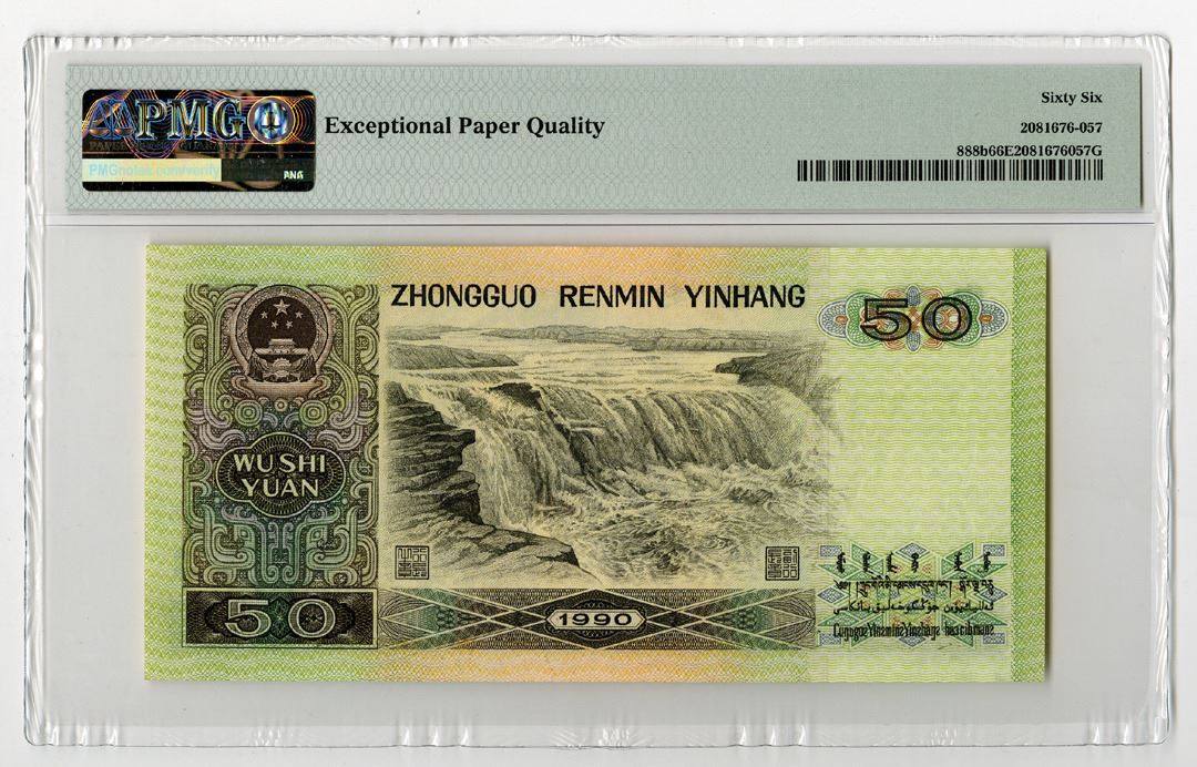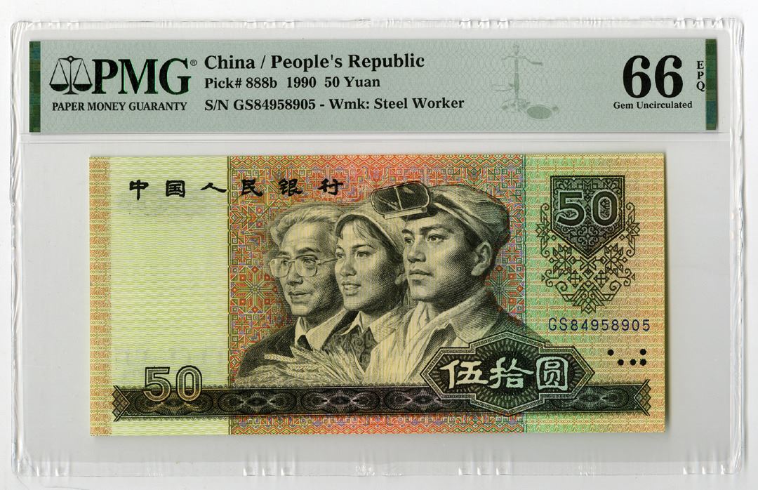 China. People's Republic. 1990. 50 Yuan, P-888b, Issued banknote, Black on multicolor underprint, S/N GS84958905, Watermark: Steel Worker, PMG graded Gem Uncirculated 66 EPQ.