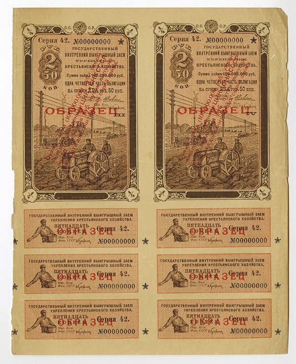 Russia, 1928, Uncut pair of bonds, Both are specimen 2 Ruble 50 Kopek 4% internal state lottery for agricultural strengthening, small size format with 6 coupons attached, series 42 serial 00000000, multi-overprinted "_______" in red (Russian for specimen), each of the two subjects has hammer and sickle coat of arms at top center of frame, tan and brown text in Russian. Very Fine with some margin imperfections. Printed by GOZNAK.