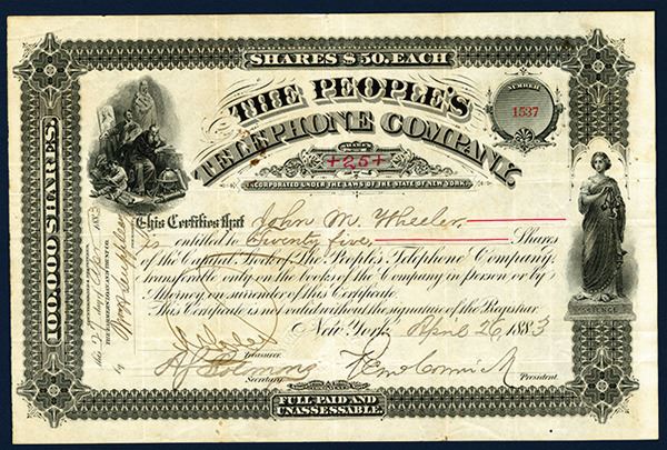 New York. 1883, I/U Stock, 25 Shares, #1537, Black text with ornate black border, Allegorical woman standing in border and artist and scholar in top left corner, Fine condition with toning and creases, ABNC. Very early telephone company stock.