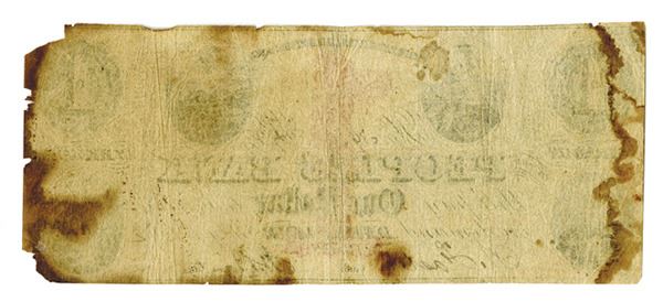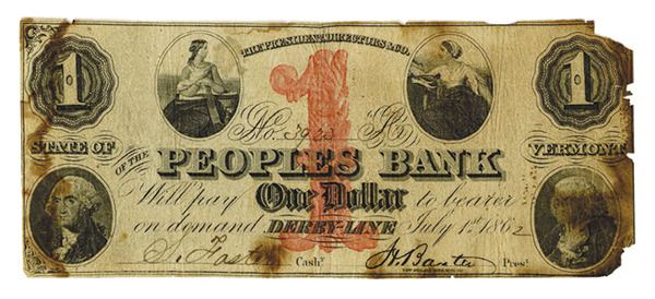 Derby Land, Vermont, $1, I/U, Washington and Franklin at lower left and right corners, allegorical women flank red "1" protector in middle, the note would have been Choice Fine to Very Fine but there are stains and pieces missing on the top and bottom right margin and corners and stains on the left margin, scarce note in any condition. NEBNC.
