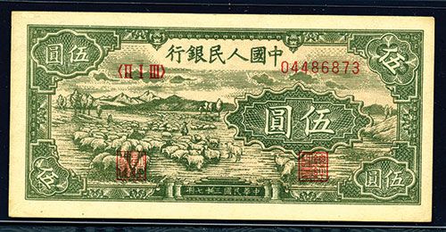 China, 1948, 5 Yuan, P-802a, (S/M#C282-2), Block 213, S/N 04486873, Issued banknote, Gray-green with sheep at left, back same color, extremely conservatively PMG graded Choice Very Fine 35 EPQ but for all appearances it should be graded Choice XF to AU. There are no evidence of folds and only light toning on the right border and two very lightly jammed corners that keep this very attractive note from Choice AU to Unc.