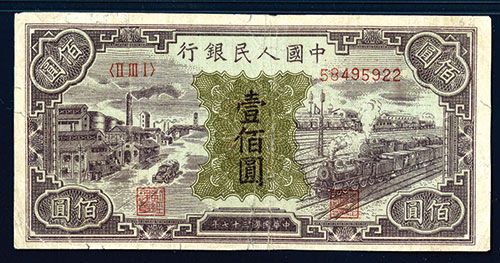 China, 1948, 100 Yuan, P-807a, (S/M#C282-10), Block 231, S/N 58495922, Issued banknote, Brown-violet on light blue underprint with olive green guilloche in center, factory at left, locomotive on right, PMG graded Choice Fine 15 NET with notations of repairs with evidence of small margin tears on the top and left margins. 1 of 15 graded and authenticated by PMG, rare note in any condition,