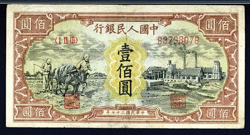 China, 1948, 100 Yuan, P-808b, (S/M#C282-9), Block 123, S/N 83738078, Issued banknote, Black and brownish red with light yellow green guilloche in center, factory at right, farmer plowing with oxen at left, back light orange brown, Watermark Star, PMG graded Very Fine 30, one of only 9 graded by PMG, attractive note for the grade. Rare in any condition.