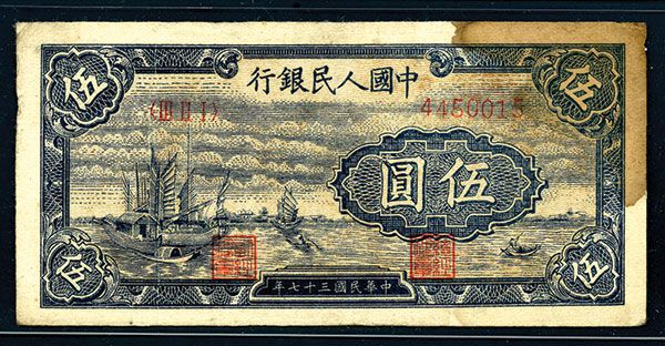China, 1948, 5 Yuan, P-801a, (S/M#C282-3), Block 321, S/N 4450015, Issued banknote, Dark blue, junks at left, back pea green, PMG graded Choice Very Fine 25 NET with stains on the top right corner of the note, no folds.