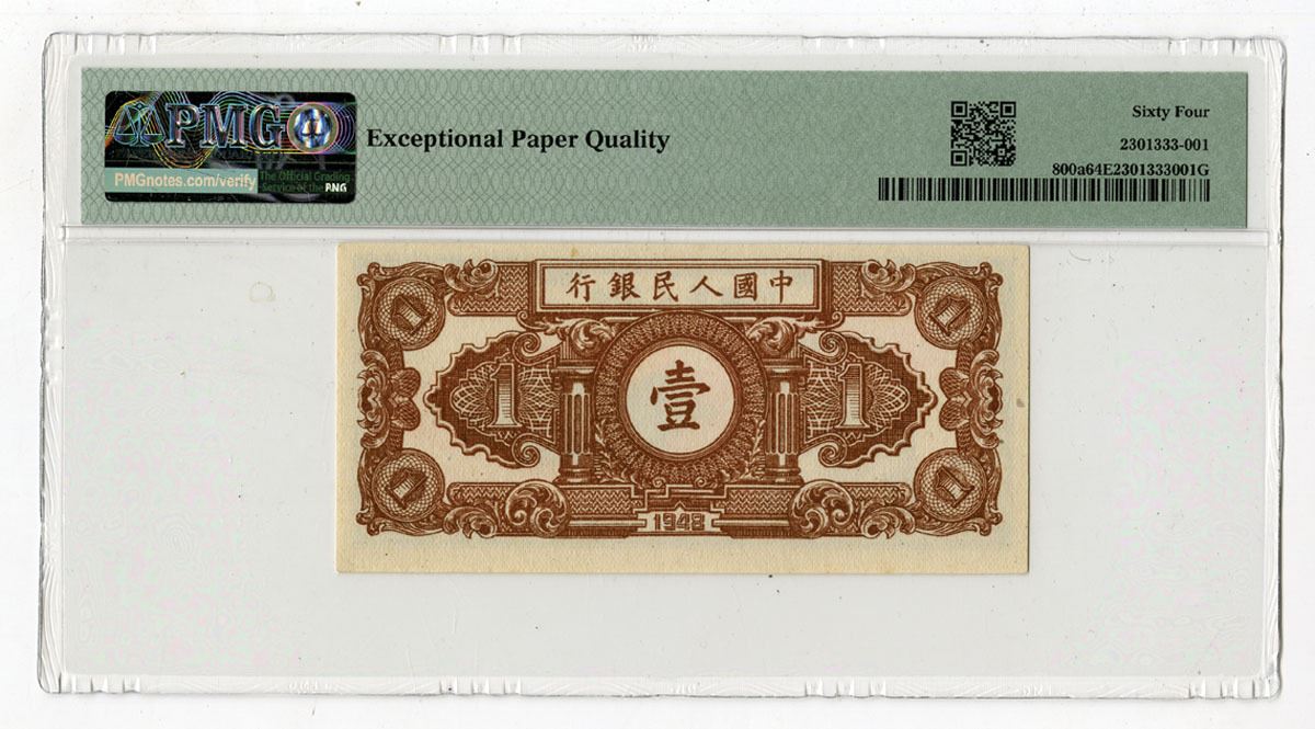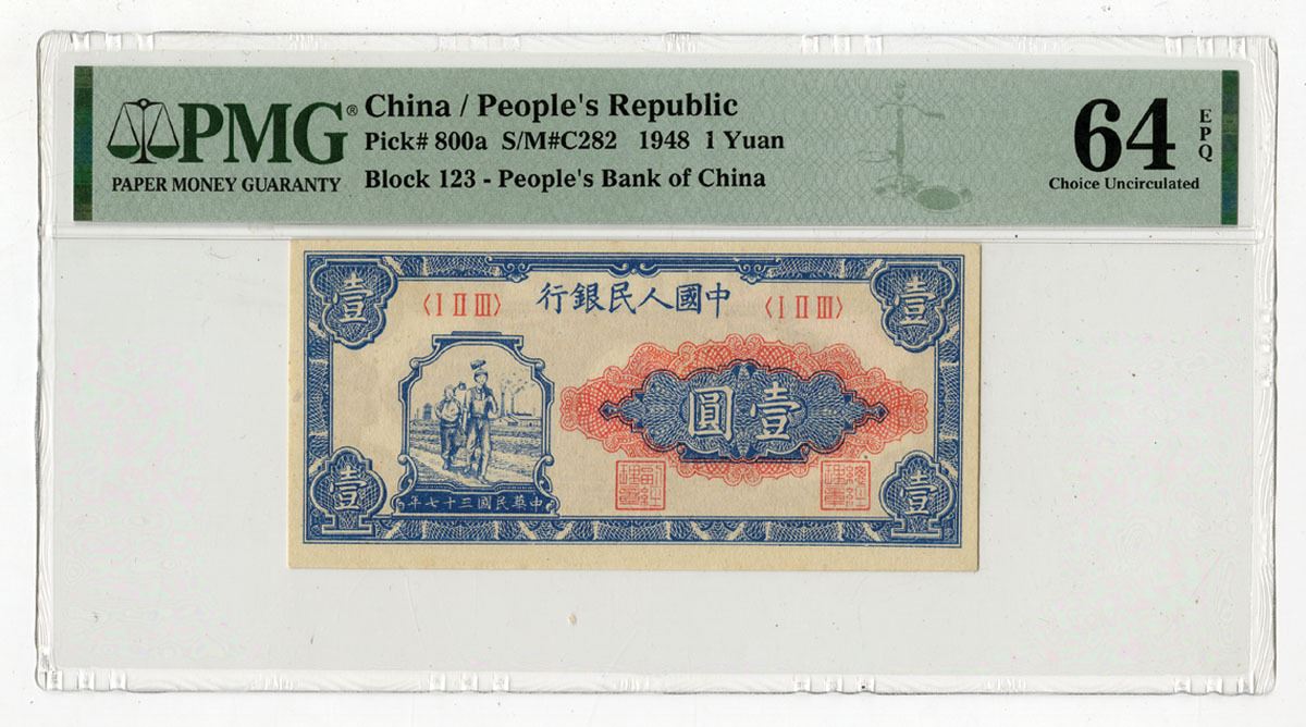 China, 1948. 1 Yuan, P-800a S/M#C282-1, Blue on light red underprint with workers at left, Back is dark brown, Block 123, PMG graded Choice Uncirculated 64 EPQ.