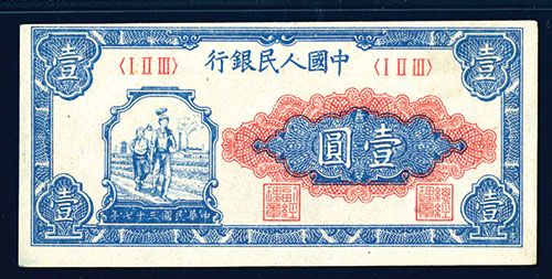 China, 1948, 1 Yuan, P-800a, (S/M#C282-1), Block 123, Issued banknote, Blue and red, Two field workers at left, Brown back, PMG graded About Uncirculated 55.
