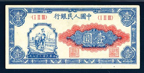 China, 1948, 1 Yuan, P-800a, (S/M#C282-1), Issued banknote, Blue and red, Two field workers at left, Brown back, PMG graded About Uncirculated 55.