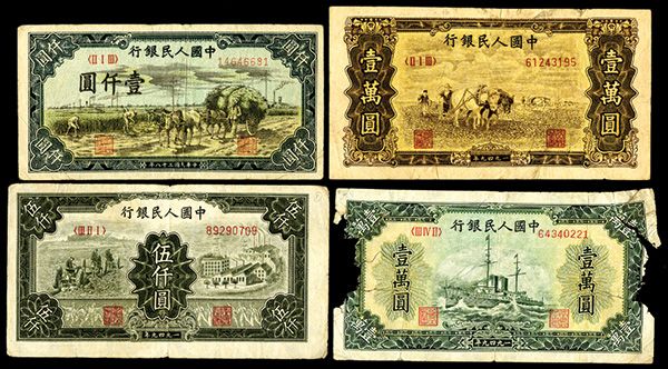 China, Lot of 4 notes, Includes 1000 Yuan, P-849, VF-XF; 5000 Yuan, P-852, VF to Choice VF; 10,000 Yuan, P-853, VF to VF+ and 10,000 Yuan, P-854 in Fine with tears and missing pieces. Attractive banknote assortment.