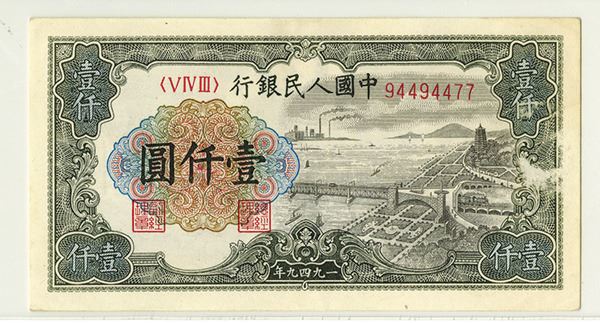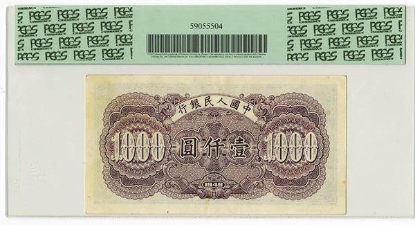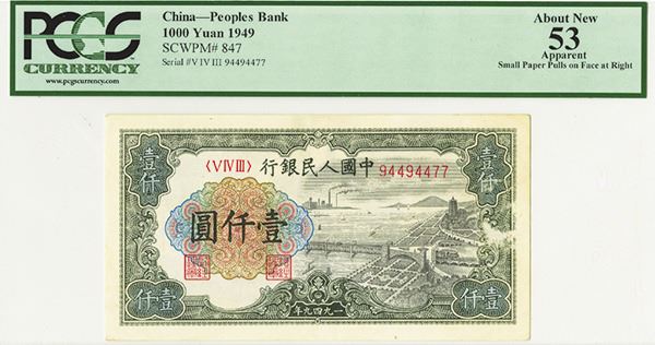 China, 1949, 1000 Yuan, P-847a, (S/M#C28260), Issued banknote, Green and grey on m/c underprint, Town view at left, S/N 94494477, Block 5-4-3, PCGS graded About New 53 Apparent with note of small paper pulls on face at right middle, the note offers large margins and a fresh appearance.
