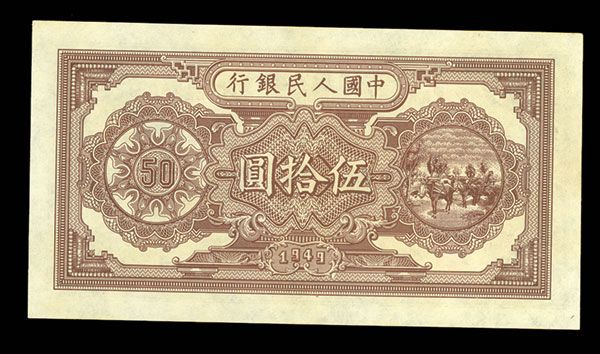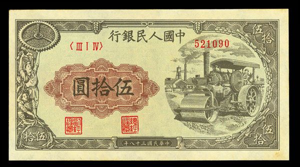 China, 50 Yuan, P-828, S/M#C282-37, Issued banknote, Block III-I-IV, S/N 521090, Gray-olive with brown guilloche at left, steam roller on right, back reddish brown, Extremely attractive note that appears in Choice to Gem Uncirculated, please view and judge for yourself. Scarce note in this high of grade.