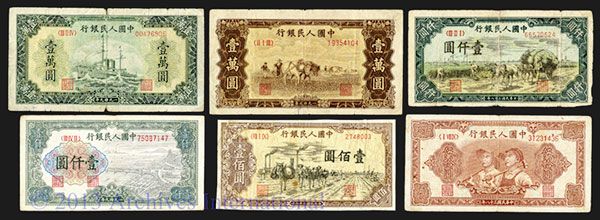 China, Lot of 6 notes, Includes 50 Yuan, P-830, S/M#C282-36, graffiti on back, VF; 100 Yuan, P-836, S/M#C282-46, Fine; 1000 Yuan, P-847, S/M#C282-61, VF to XF; 1000 Yuan, P-849, S/M#C282-60, Fine with 3 strong vertical folds; 10,000 Yuan, P-853, S/M#C282-67, VF; 10,000 Yuan, P-854, S/M#C282-66, Fine with strong vertical middle fold and small splits on top and bottom middle edges at folds. Useful banknote assortment.