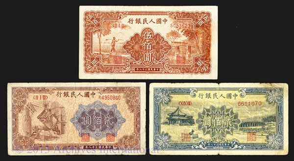 China, Lot of 3 notes, all 1949 issues, Includes 200 Yuan, P-840 and P-841, Fine to VF and 500 Yuan, P-842, S/M#C282-56, Choice VF to XF, Attractive banknote assortment.