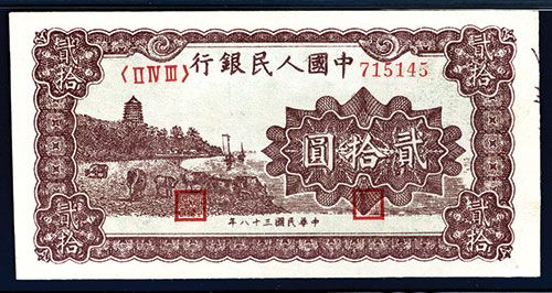 China, 1949, 20 Yuan, P-819a, (S/M#C282-31), Block 243, S/N 715146, Issued banknote, Lilac-brown, pagoda at shoreline at left, back black, Superb note that is virtually Uncirculated but is PMG graded conservatively Choice About Uncirculated 58 EPQ (Exceptional Paper Quality), Only 8 notes graded higher then this lovely example by PMG , large even margin, sharp corners and bright colors only enhance this amazing note that will be a treasure for any advanced collector.