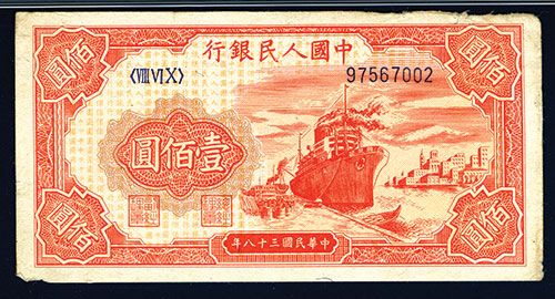 China, 1949, 100 Yuan, P-831b, (S/M#C282-43), Block 860, S/N 97567002, Issued banknote, 8 digit serial number, red on light orange and brown underprint, Ship at dockside at right, back red on light orange, PMG graded Choice Extremely Fine 45, light toning on right margin and rough top right margin are the only detracting items to note for this note with no folds due to circulation in the body of the note, only rounded corners, one with a light bend that relegates this note to XF instead of AU condition.