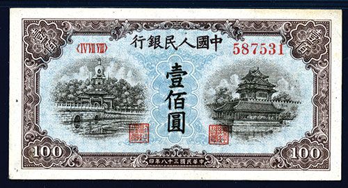China, 1949, 100 Yuan, P-832a, (S/M#C282-44), Block 478, S/N 587531, Issued banknote, 6 Digit S/N, Watermark Stars, Dark brown and black on light blue underprint, Bridge and Peking Pagoda on left, Shrine at right, Exceptional appearing note that is PMG graded Extremely Fine 40 with one very light vertical fold and one corner bend keeping this lovely note from AU.