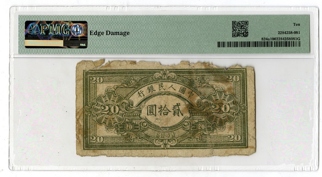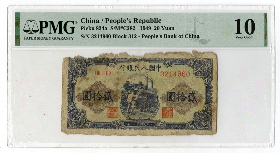 China. 20 Yuan, P-824a, S/M#C282, Issued banknote, Blue on light green underprint, Workers pushing ore car at center, Back olive-green, S/N 3214960 Block 312, PMG graded Very Good 10 with comment "Edge Damage". Not that pretty but very rare and missing from most collections in any condition.