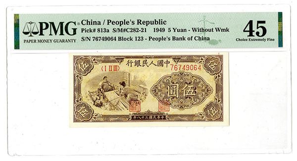 China. 5 Yuan, P-813a, S/M#C282-21, Issued banknote, Brown on light gold underprint, weavers at left, back dark brown, Roman Numeral Block 123, S/N 76749064, PMG graded Choice Extremely Fine 45, very attractive note for the grade.