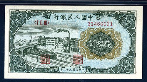 20 Yuan, P-821a (S/M#C282-32), Issued banknote, Green on m/c, train under bridge with factory on left, Block I II III (123), S/N 31466021, PMG graded Choice Uncirculated 64 EPQ (Exceptional Paper Quality), attractive for grade.