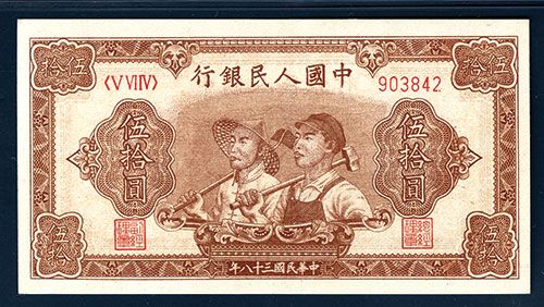 50 Yuan, P-830a (S/M#C282-36), Issued banknote, Red-brown, farmer and laborer at center, Block 564, S/N 903842, PMG graded Choice About Uncirculated 58 EPQ (Exceptional Paper Quality), with one extremely light vertical middle fold keeping this lovely note from Choice Uncirculated, a premium example for the grade.