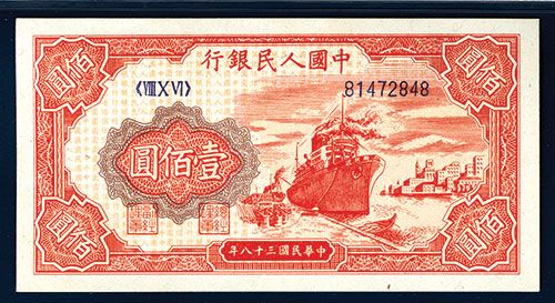 100 Yuan, P-831b (S/M#C282-43), Issued banknote, Red on orange underprint, ship dockside at right, back with red on orange underprint, Block 806, S/N 81472848, PMG graded Choice Uncirculated 64 EPQ (Exceptional Paper Quality), Very attractive with large even margins sharp corners.
