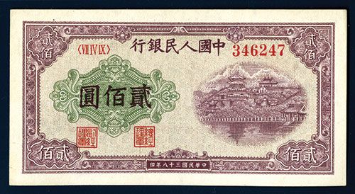 200 Yuan, P-837a2 (S/M#C282-51), Issued banknote, Lilac brown with green guilloche, back brown on light olive underprint, Block 749, S/N 346247, PMG graded Choice Uncirculated 64. Large even margins and bright colors which will be difficult to improve upon and only 3 notes graded higher in the PMG census.