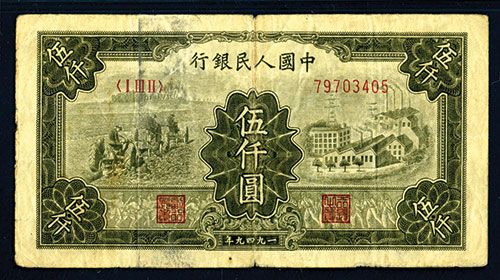 5000 Yuan, P-852a (S/M#C282-64), Issued banknote, Black-Green on m/c, Three tractors at left, factory at right, Block I III II (132), S/N 79703405, Wmk: Triangle Pattern, PMG graded Choice Fine 15, attractive for grade.
