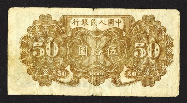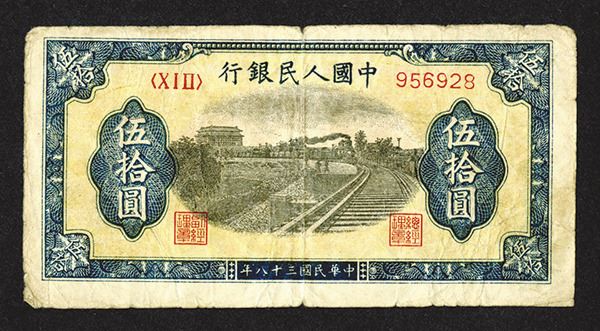 China. 50 Yuan. P-829. Steam train at center. Nice Fine. (The Silicon Valley Collection)