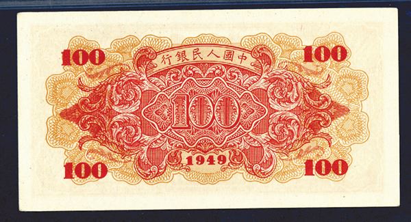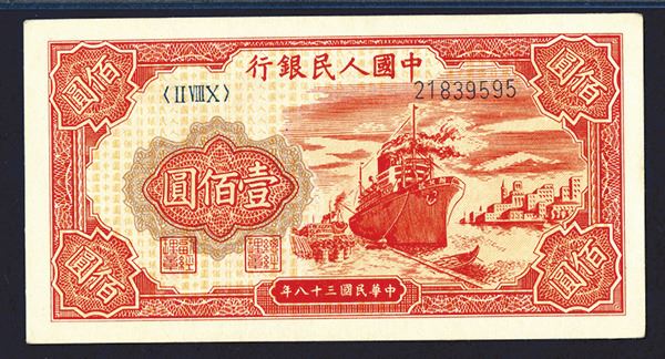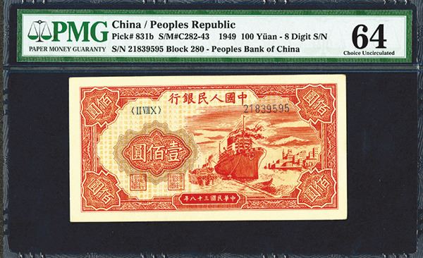 China. 100 Yuan, P-831b, S/M#C282-43, Issued banknote, Red on light orange underprint, ship at dock at right, back red on light orange, Roman Numeral Block 2-8-10, S/N 21839595, PMG graded Choice Uncirculated 64. Scarce in high grade and very attractive with large even margins.