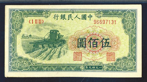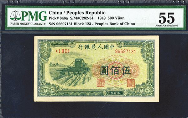 China. 500 Yuan, P-846a, S/M#C282-54, Issued banknote, Green on light green, tractor plowing at left, back green on tan underprint, Roman Numeral Block 1-2-3, S/N 96697131, PMG graded About Uncirculated 55 with the appearance of better. Scarce in high grade and very attractive with large even margins.