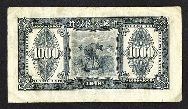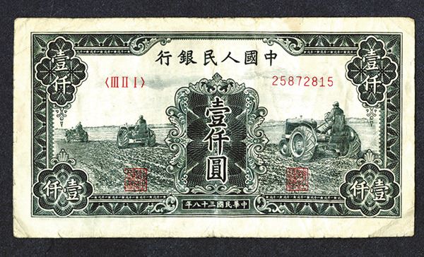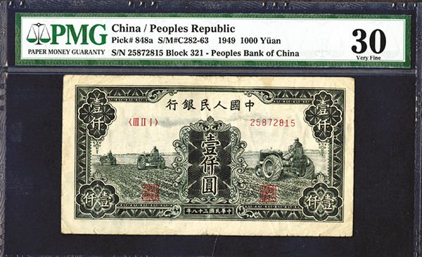 China. 1000 Yuan, P-848a, S/M#C282-63, Issued banknote, Blue-black, tractor in middle, Roman Numeral Block 3-2-1, S/N 25872815, PMG graded Very Fine 30, bright colors with large margins. (The Silicon Valley Collection)