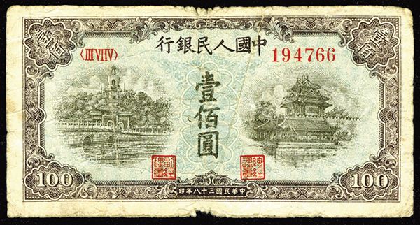 China. 100 Yuan, P-832, S/M#C282-44, Issued banknote, Dark Brown and black on light blue underprint, back purple on blue, Roman Numeral Block 3-6-4, S/N 194766, VG condition. (The Silicon Valley Collection)