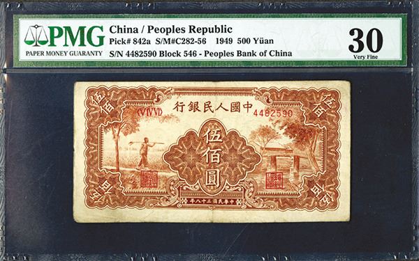 China. 500 Yuan, P-842a, S/M#C282-56, Issued banknote, Reddish-brown, Roman Numeral Block (5-4-6), S/N 4482590, PMG graded Very Fine 30. (The Silicon Valley Collection)