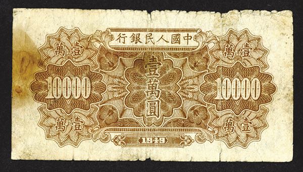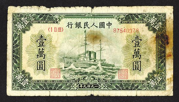China - Republic. 10,000 Yuan. P-854. Warship at center. Edge roughness and stain at right. Very Good.